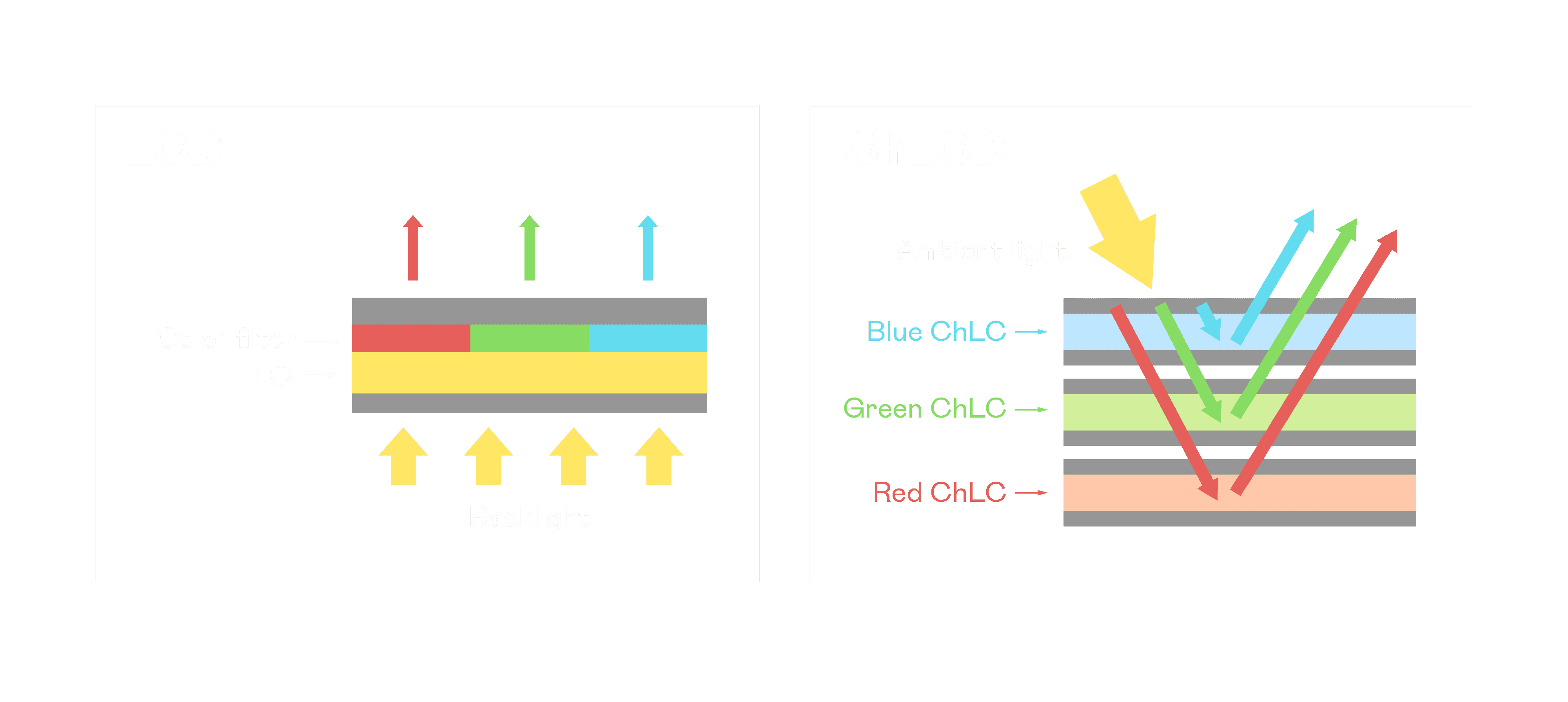ChLCD 胆固醇液晶就如同纸张一样,,透过反射环境光来显示影像,,,因此长时间观看不易造成人眼视觉疲劳,,,,可达到护眼效果。。。当处于户外阳光下使用,,LCD 影像容易失真而不易观看,,,,但胆固醇液晶仍可维持较佳的影像品质。。。