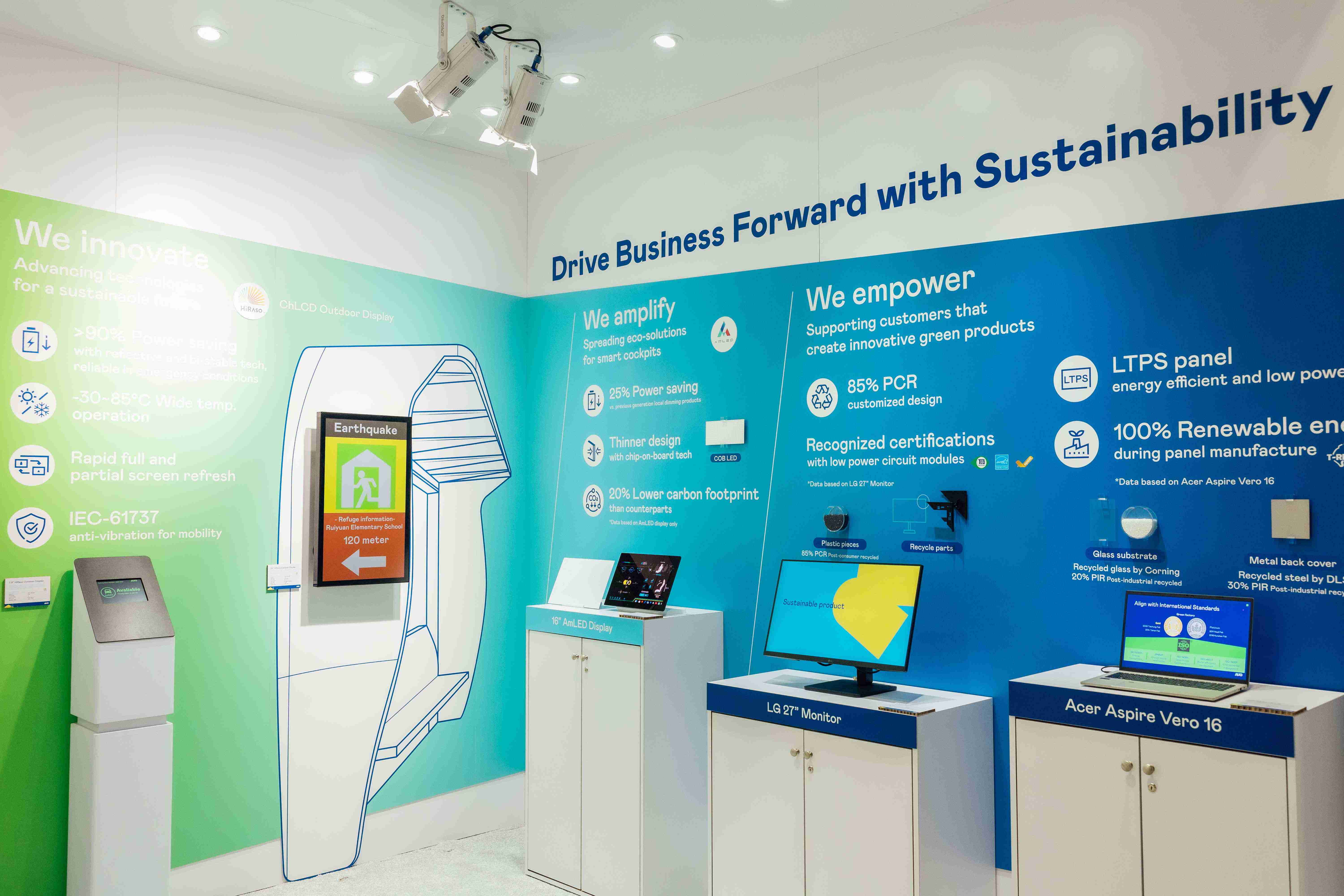尊龙集团运用创新显示技术HiRaso胆固醇液晶双稳态技术达到显示零耗能、、、、扩大节能省电的AmLED显示技术应用于车用产品、、、、以再生的消费后回收(PCR)塑料及全绿电生产之面板,,,应用于笔电及萤幕,,增加绿色价值。。。